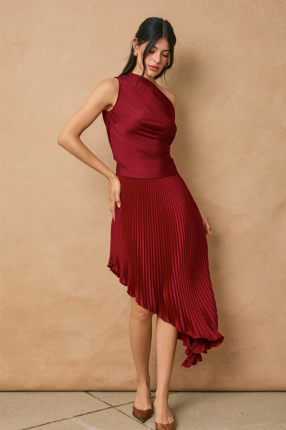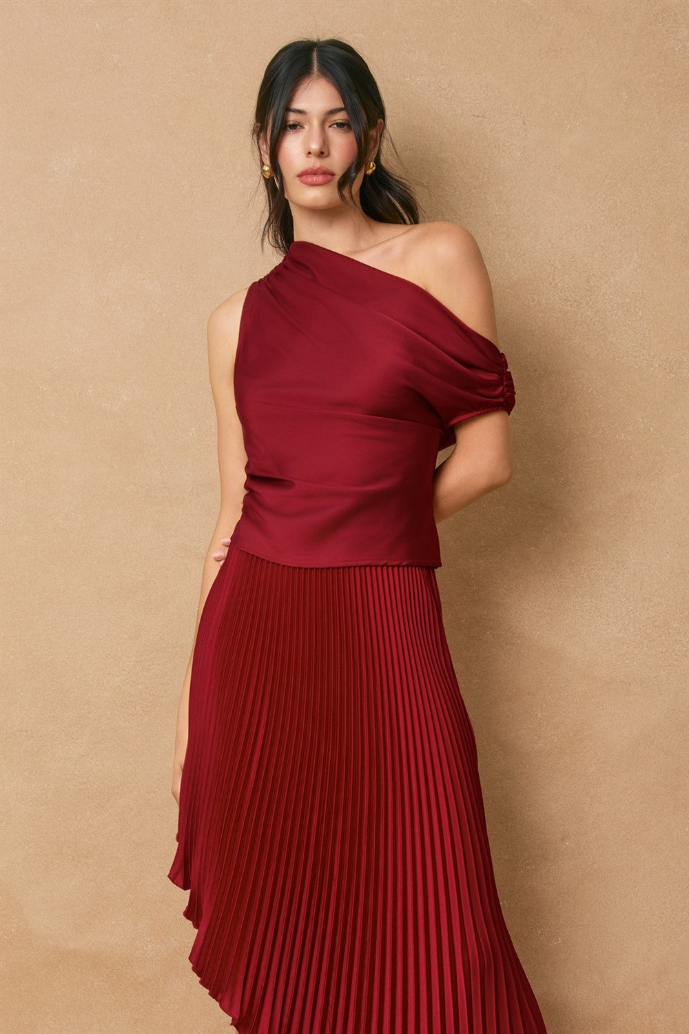 Satin top with asymmetrical design. Model is 5'8" and wearing size Small.